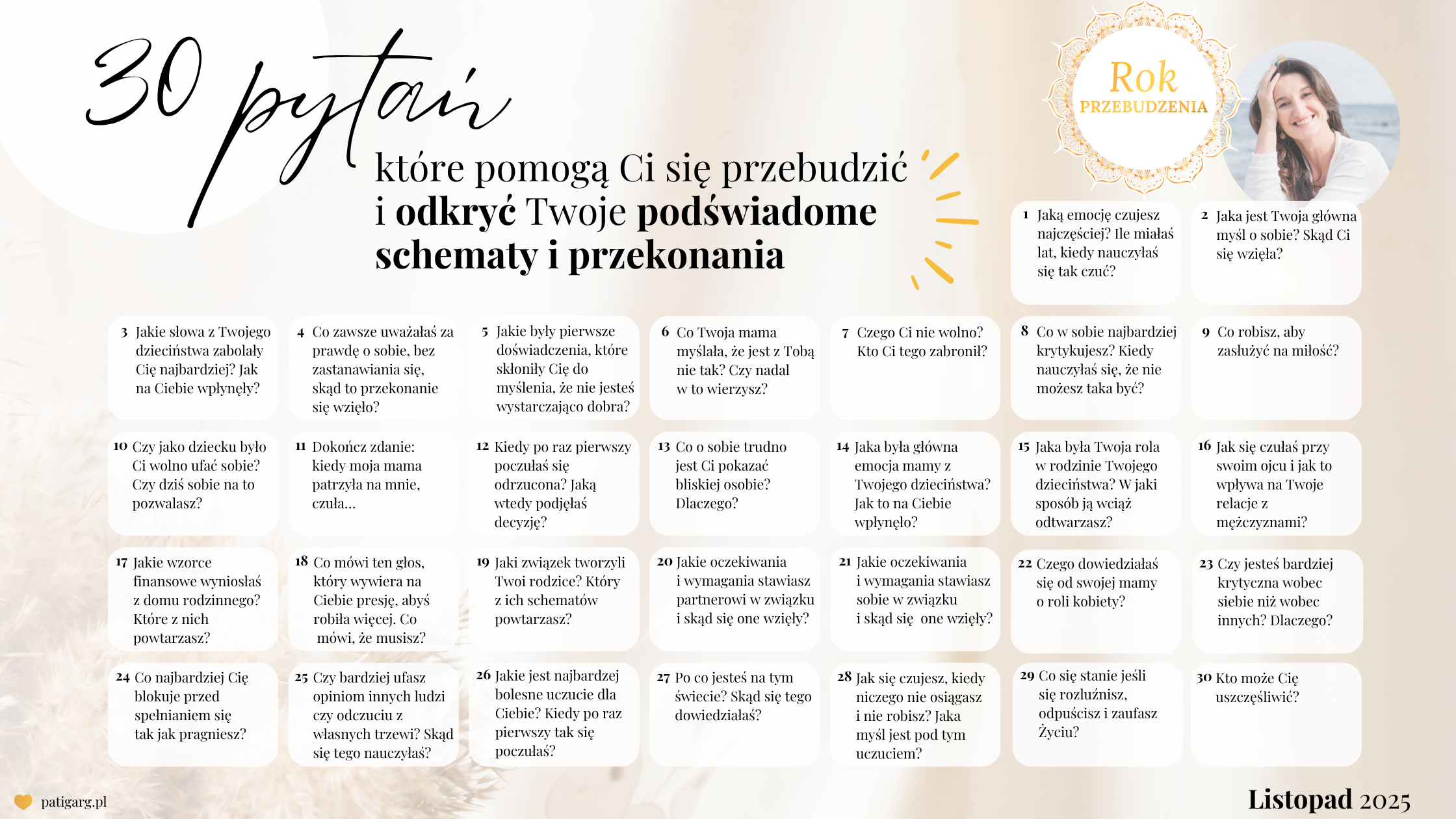 Przygotowałam dla Ciebie kalendarz na listopad z 30 pytaniami, które pomogą Ci się przebudzić, zobaczyć swoje podświadome schematy i rozpocząć głęboką podróż w głąb siebie.